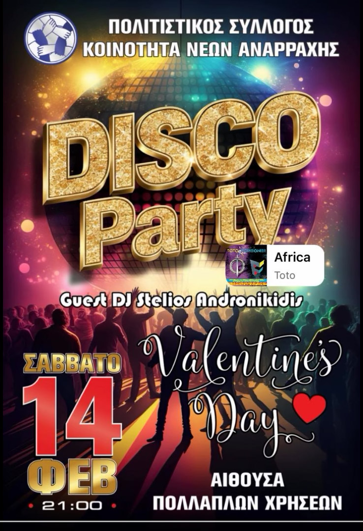 Μια βραδιά γεμάτη μουσική, χορό και εορταστική διάθεση ετοιμάζει η Κοινότητα Νέων Αναρράχης Εορδαίας για το Σάββατο 14 Φεβρουαρίου, ανήμερα του Αγίου Βαλεντίνου. Το Valentine’s Disco Party θα πραγματοποιηθεί στις 21:00 στην Αίθουσα Πολλαπλών Χρήσεων Αναρράχης, φιλοδοξώντας να δώσει ρυθμό στη γιορτή της αγάπης.